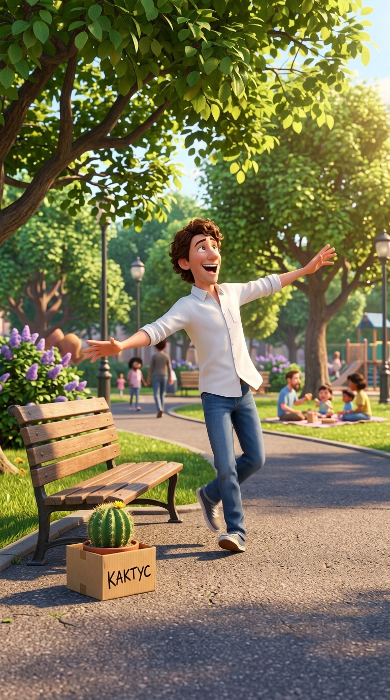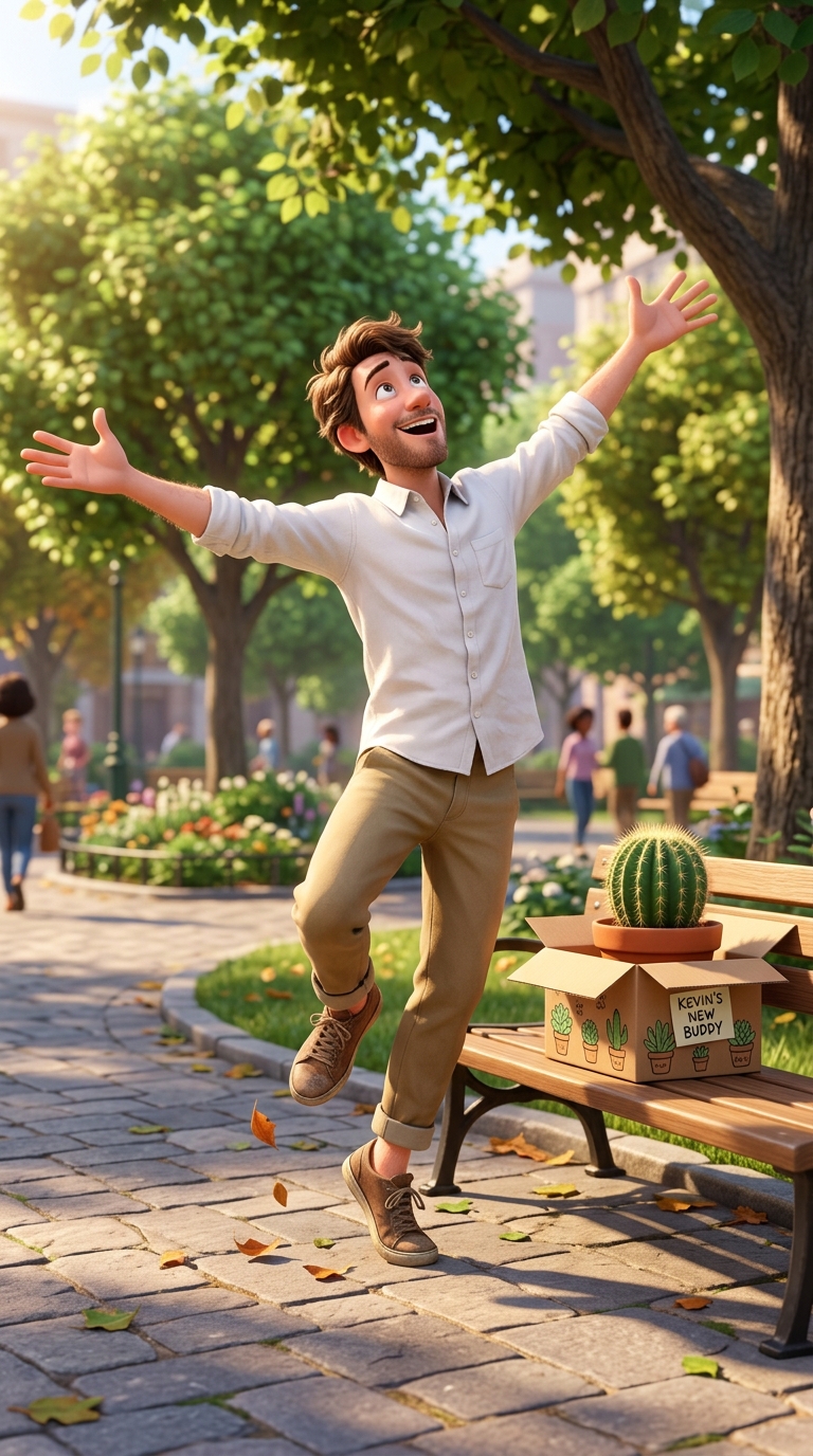 Кевин вскакивает со скамейки и радостно кружится на месте, раскинув руки....