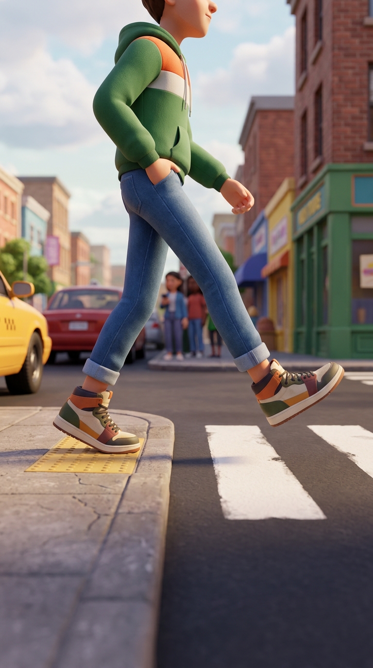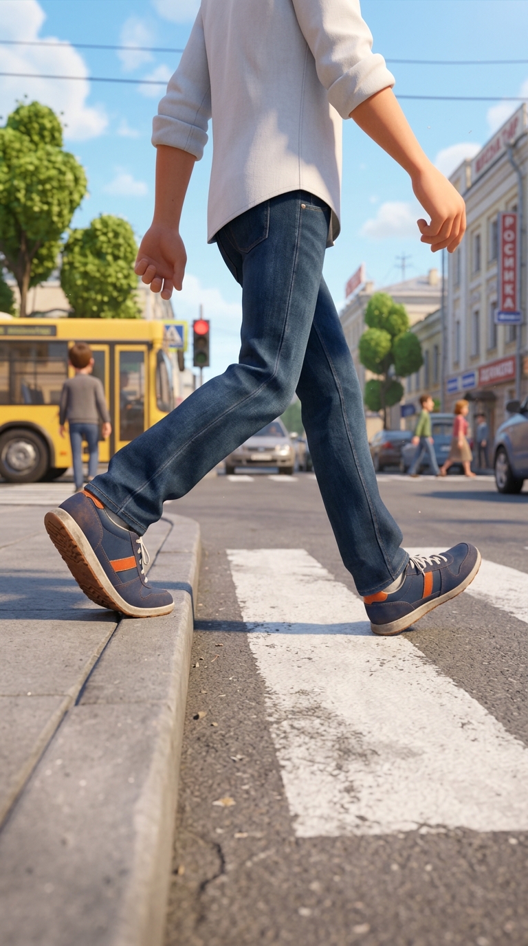 Вид от ног Кевина. Он делает большой, уверенный шаг с тротуара на пешеход...