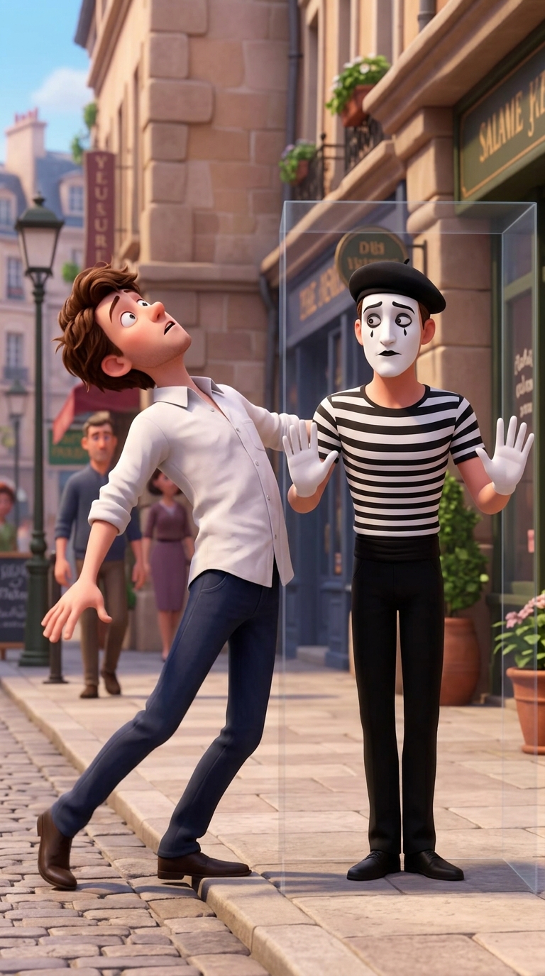 Комичная сцена. Кевин, задрав голову к небу, врезается в уличного мима, к...