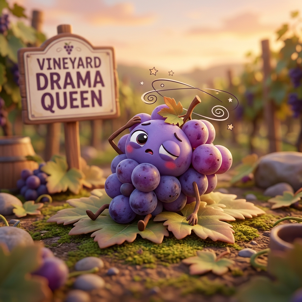 Strong rule: style --- 3D Animation, Pixar style ---. A small bunch of purple grapes, prone to fainting when events become too dramatic.