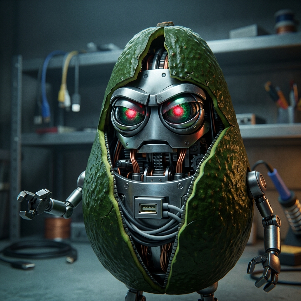 Fast zoom into the blinking red speaker inside the avocado. Flashing red light illuminates the horrified faces of the surrounding fruits....