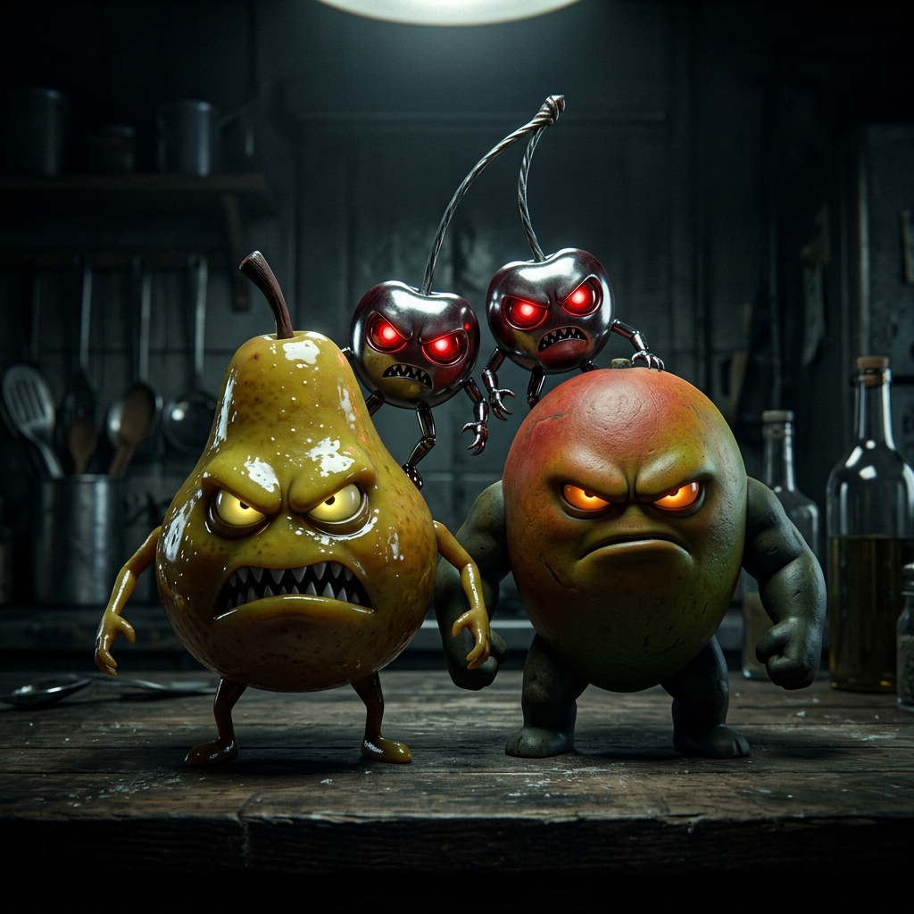 Strong rule: style --- Cinematic 3D Pixar-style animation, high contra... ---. A menacing squad of artificial fruits: a pear with a gloss...