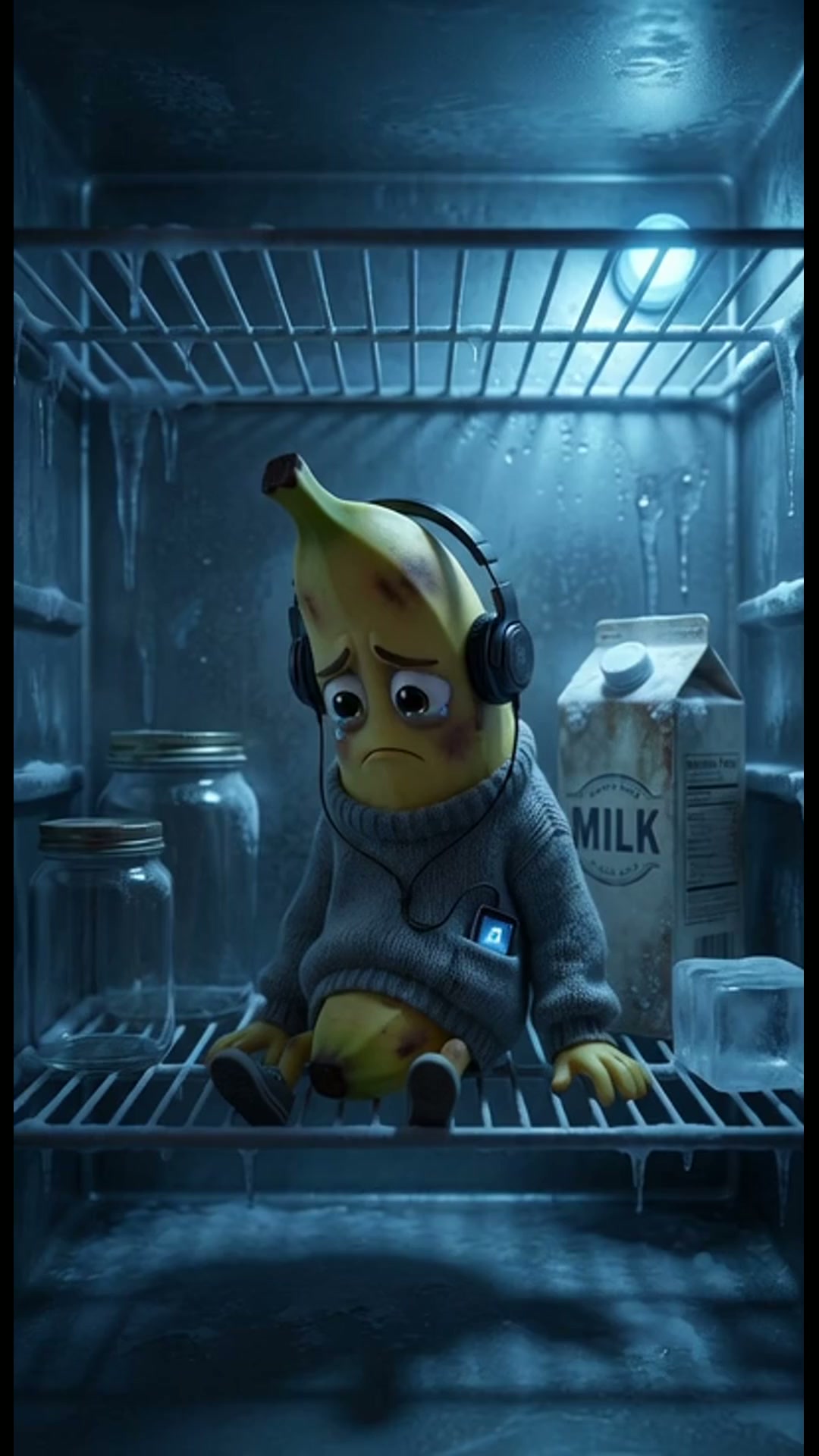 Slow zoom in on Boris. The camera captures his sad expression and the cold, lonely environment of the fridge. Soft, dramatic shadows. Of...