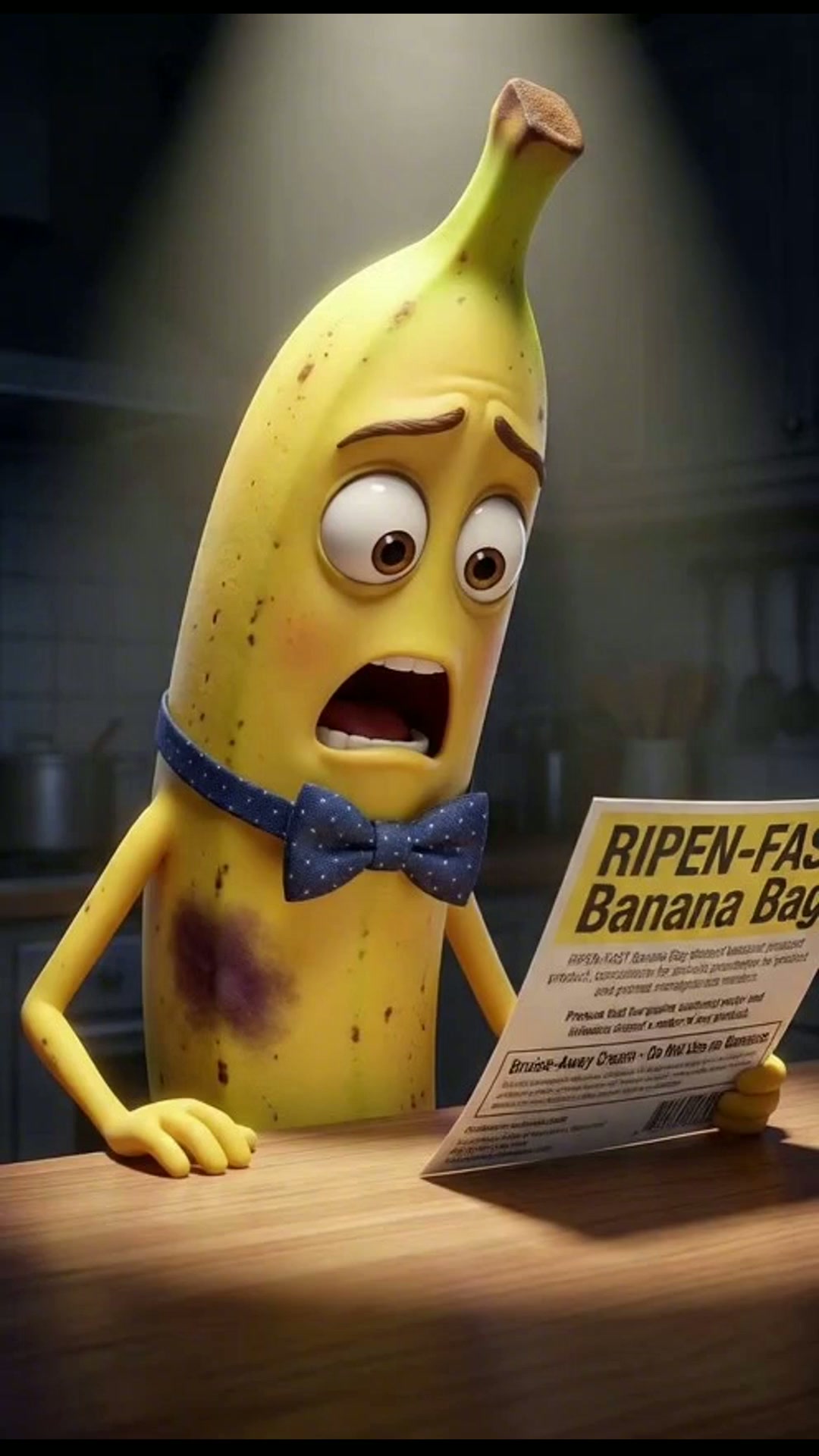 Smooth panning shot around the two fruits. Arthur sparkles perfectly under the kitchen lights. On-screen dialogue (characters speak with...