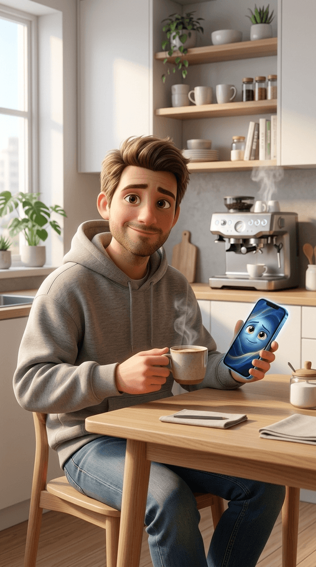 Art style: 3D Pixar. Современная кухня в скандинавском стиле, залитая утренним светом. Макс сидит за столом, держа смартфон в одной руке...
