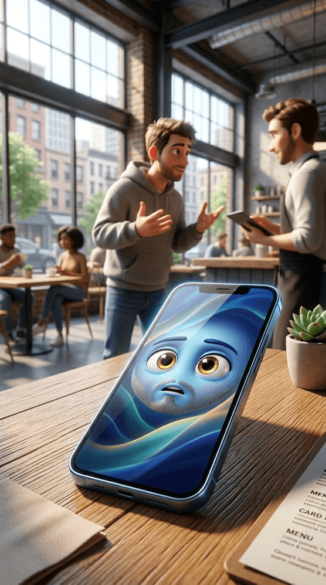Art style: 3D Pixar. Шумное городское кафе с панорамными окнами и индустриальным дизайном. На переднем плане на дубовом столе лежит смар...