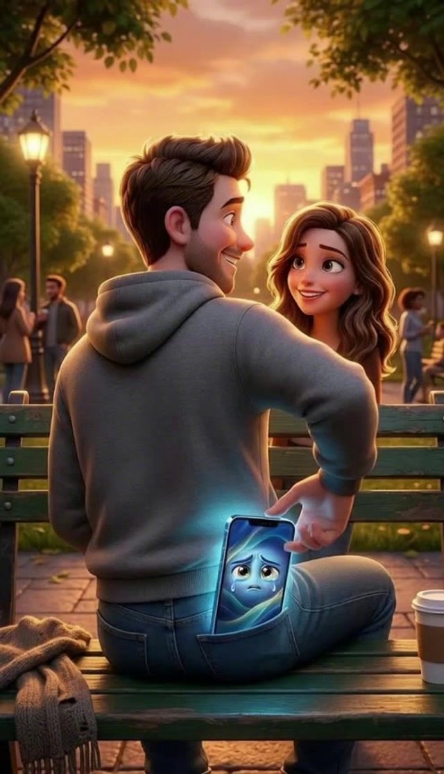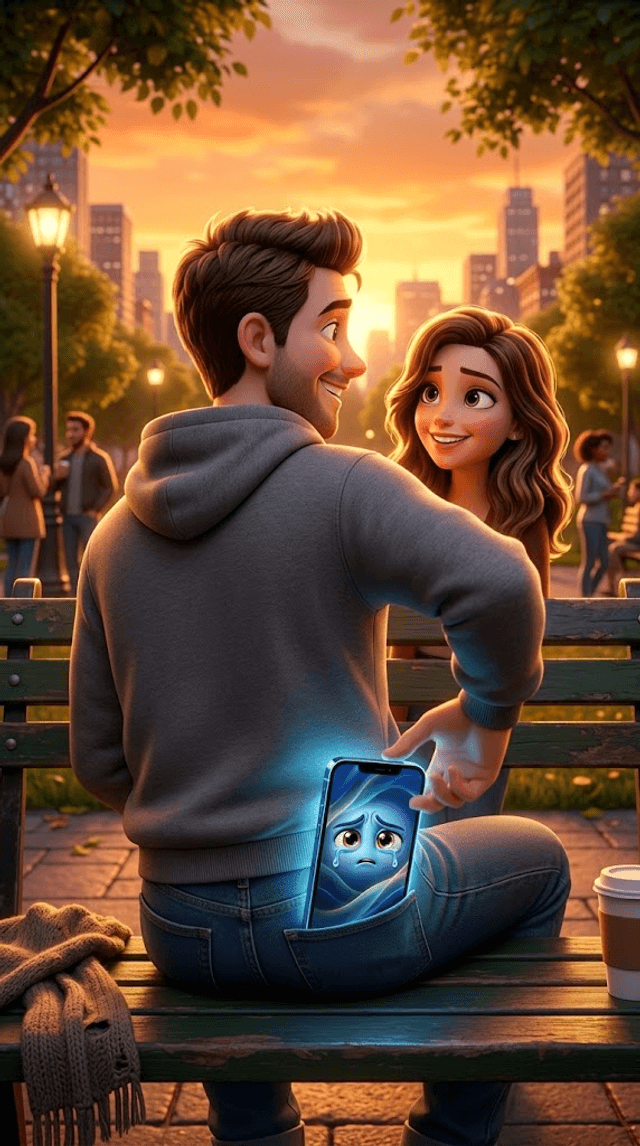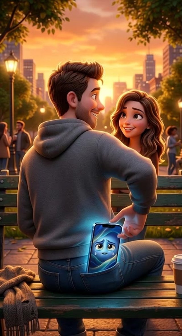 Strong rule: style --- 3D Pixar ---. Городской парк в лучах закатного солнца. Макс сидит на скамейке рядом с симпатичной девушкой, они ул...
