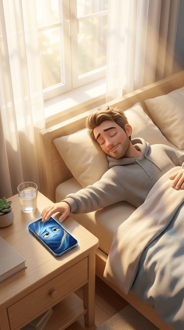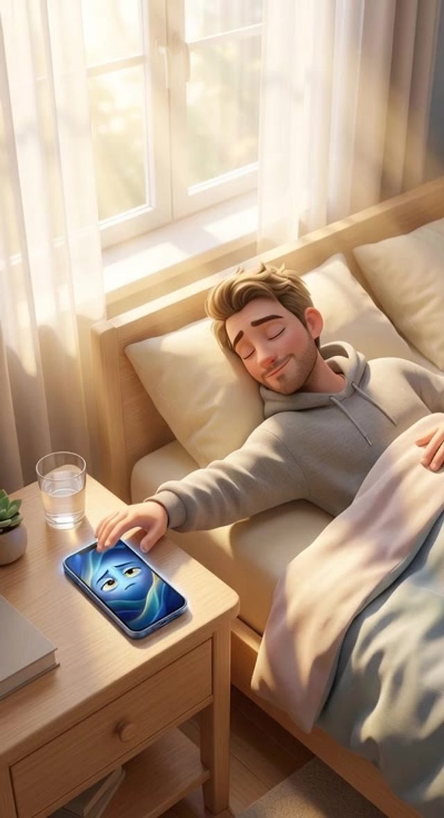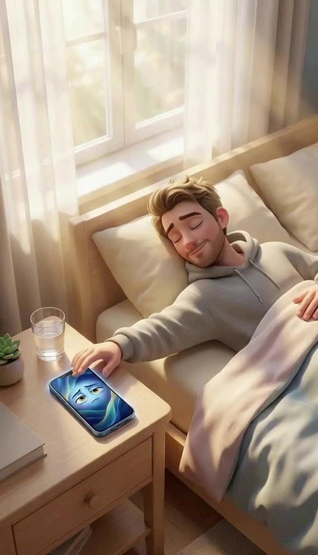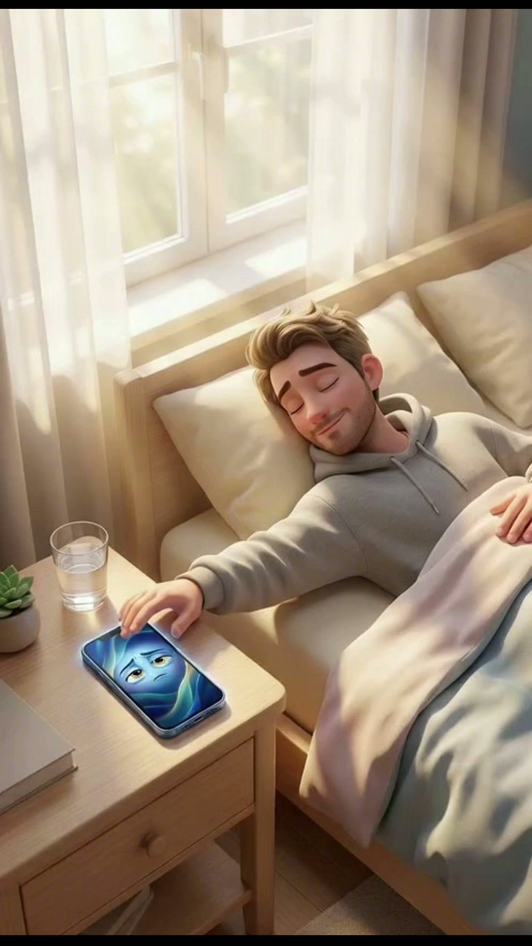 Strong rule: style --- 3D Pixar ---. Солнечная спальня ранним утром, золотистые лучи пробиваются сквозь белые занавески. На прикроватной ...