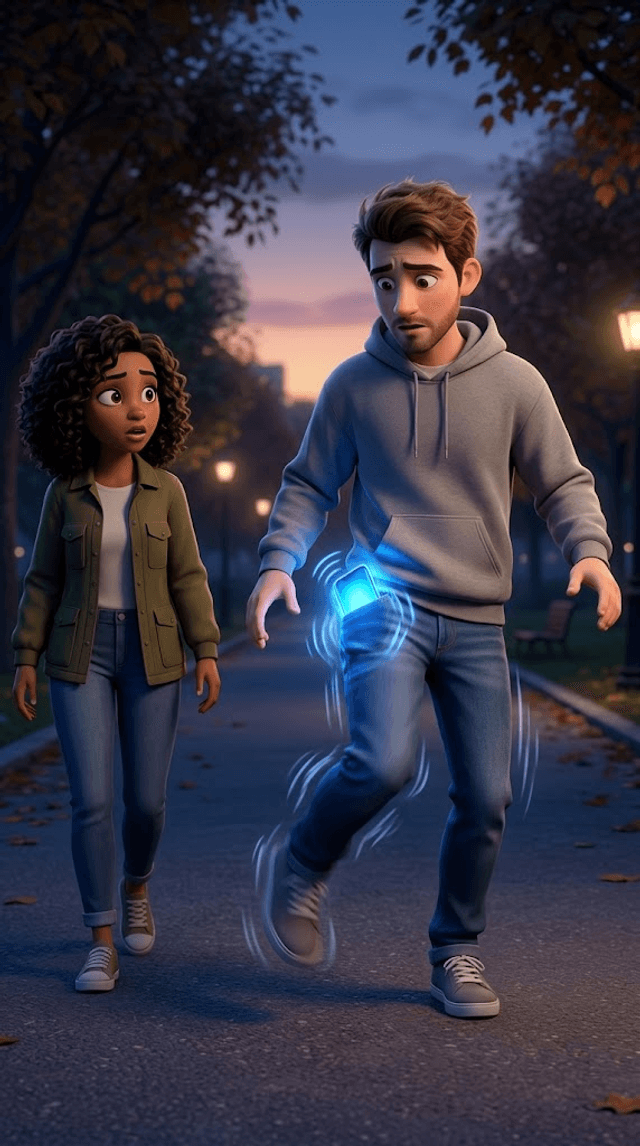 Art style: 3D Pixar. Средний план: Макс идет по дорожке парка, его нога в джинсах начинает заметно дрожать от сильной вибрации в кармане...