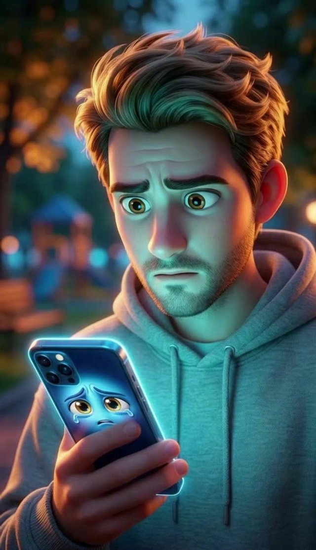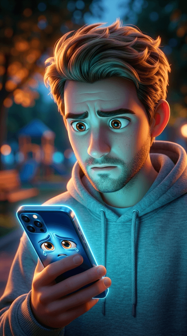 Strong rule: style --- 3D Pixar ---. Крупный план лица Макса, освещенного снизу холодным светом телефона. Он смотрит на экран с недоумени...