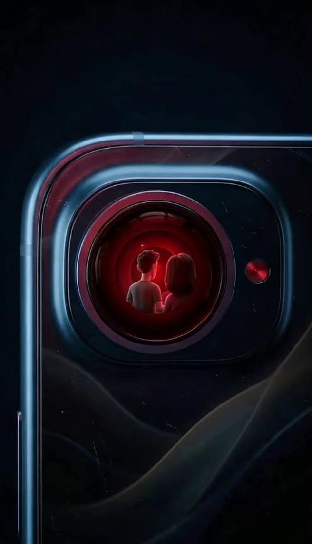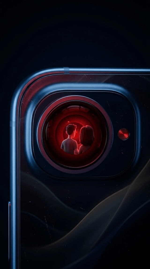 Strong rule: style --- 3D Pixar ---. Экстремальный крупный план камеры смартфона, которая светится изнутри красным зловещим огоньком. В л...
