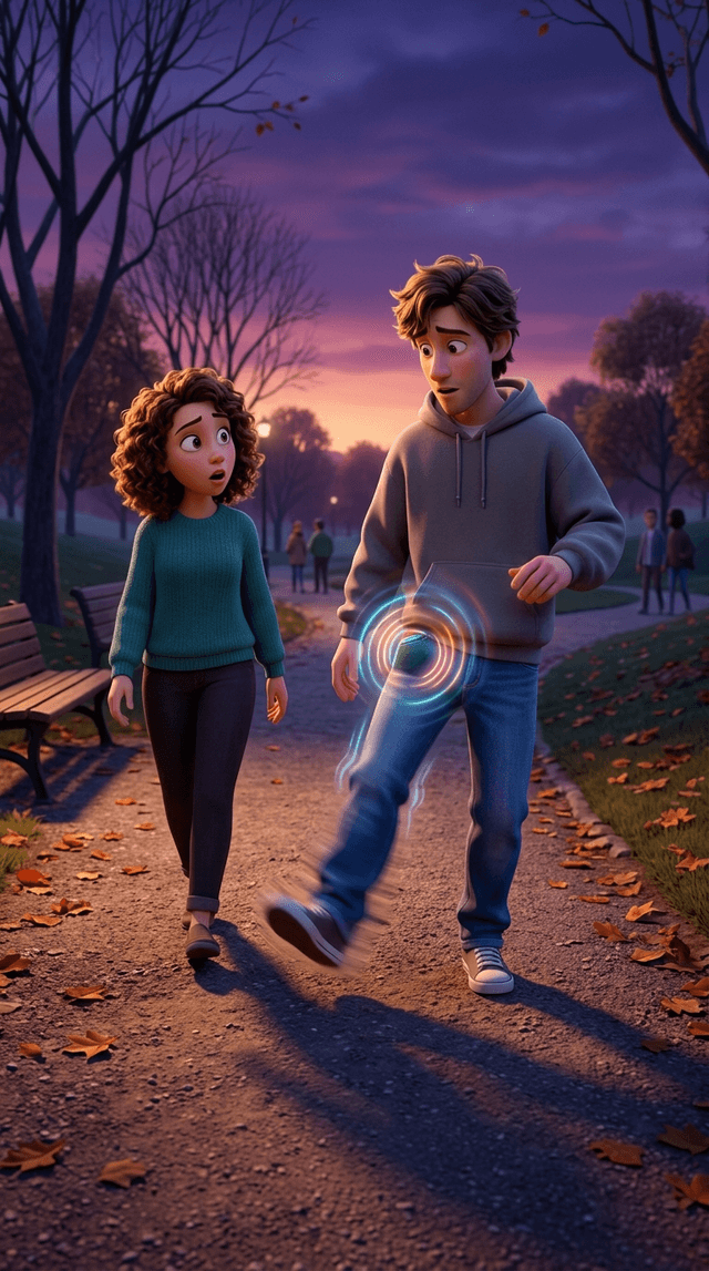 Strong rule: style --- 3D Pixar ---. Средний план: Макс идет по дорожке парка, его нога в джинсах начинает заметно дрожать от сильной виб...