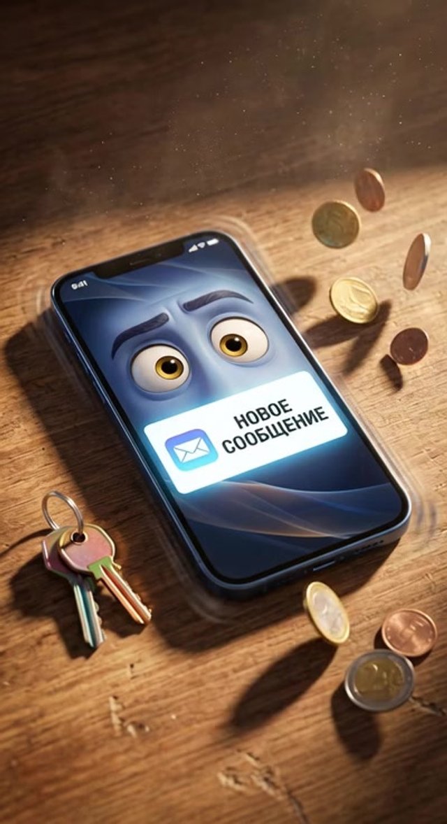 Art style: 3D Pixar. Вид сверху на деревянный стол, где смартфон начинает вибрировать. На экране всплывает яркое белое окно уведомления ...