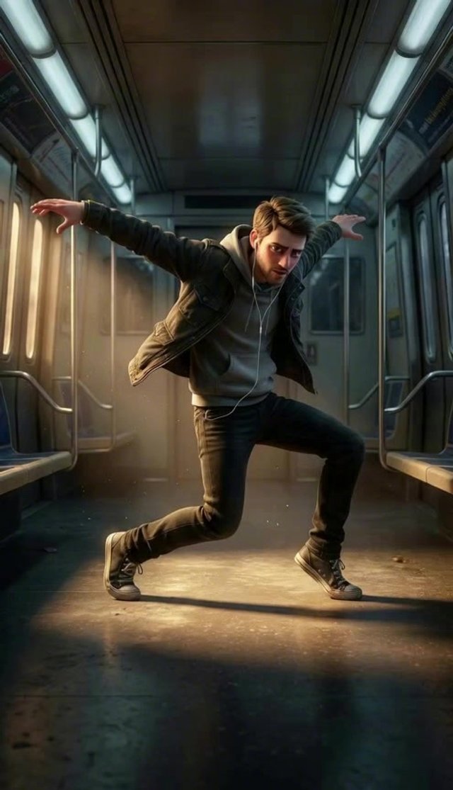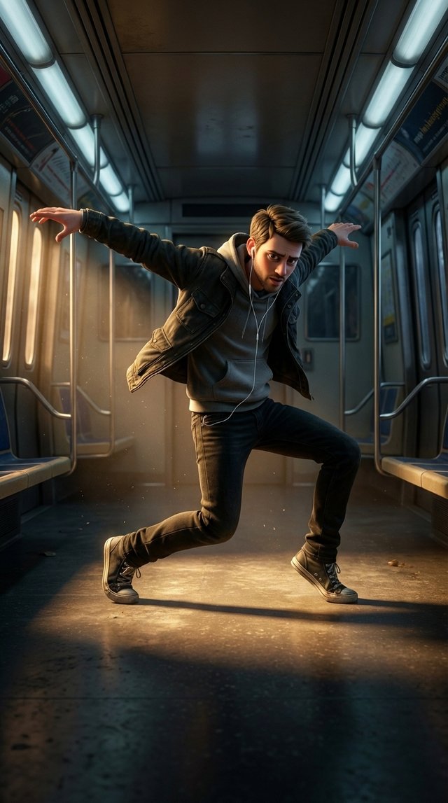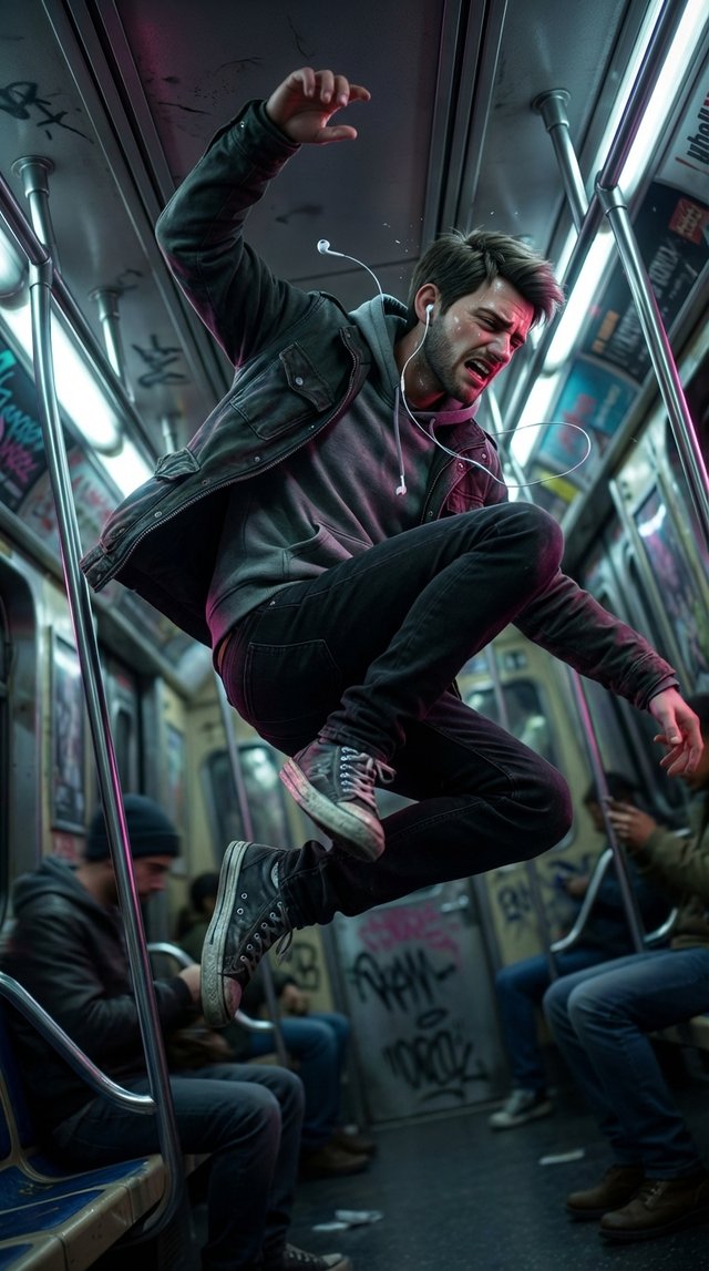 Strong rule: style --- 3D Pixar ---. Центр вагона метро в момент наивысшей динамики. Средний план с голландским углом, подчеркивающий нес...