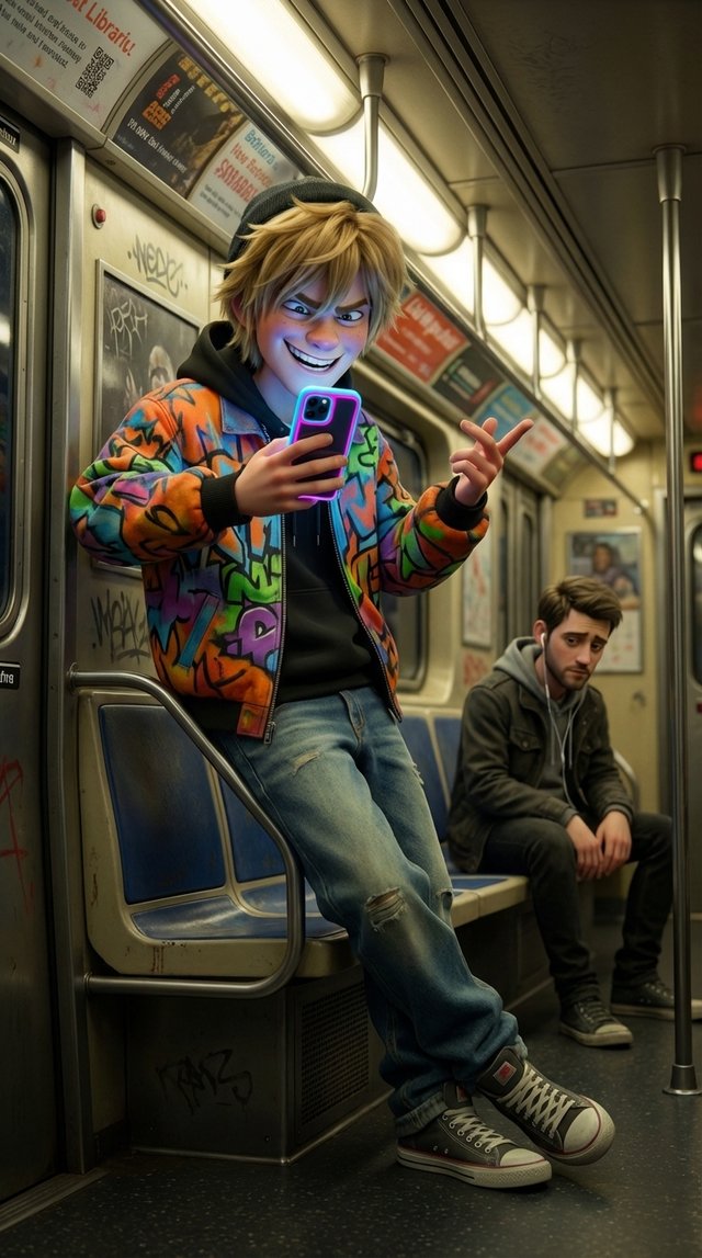Strong rule: style --- 3D Pixar ---. Угол вагона метро возле стальных поручней. Средний план снизу вверх, придающий персонажу наглый вид....