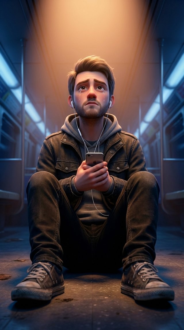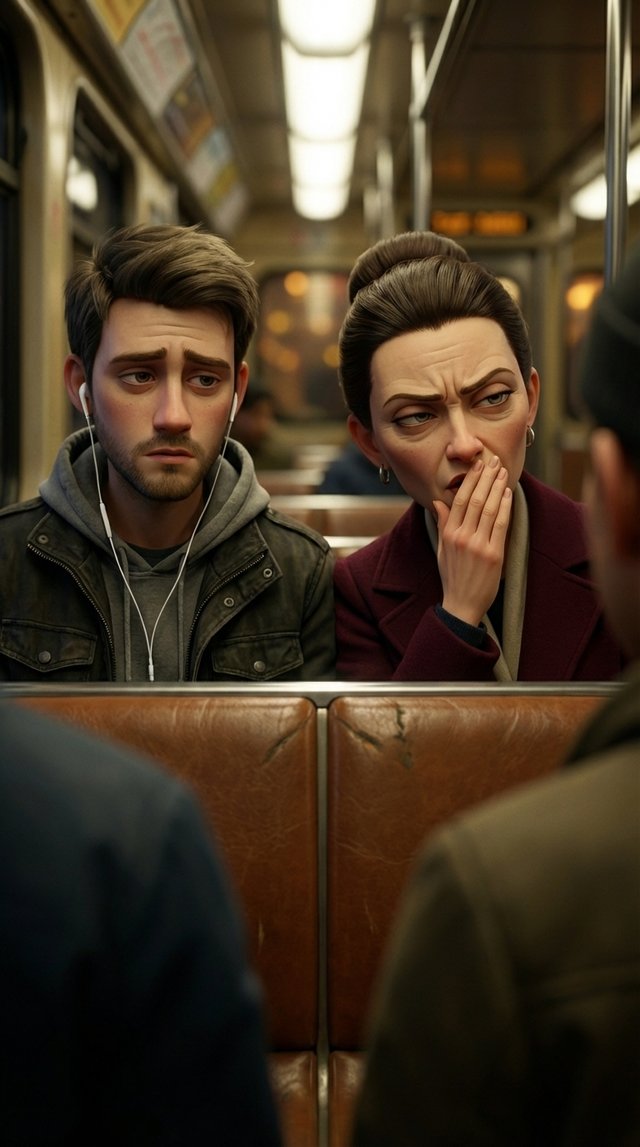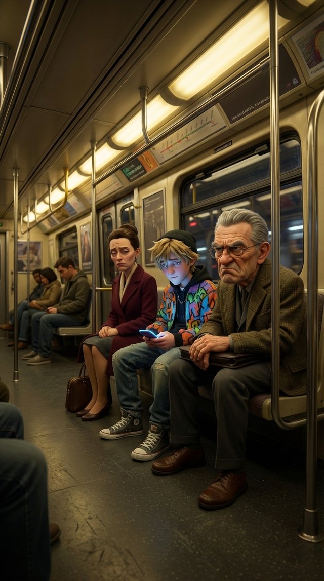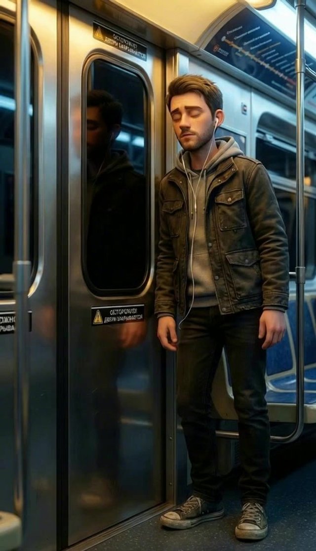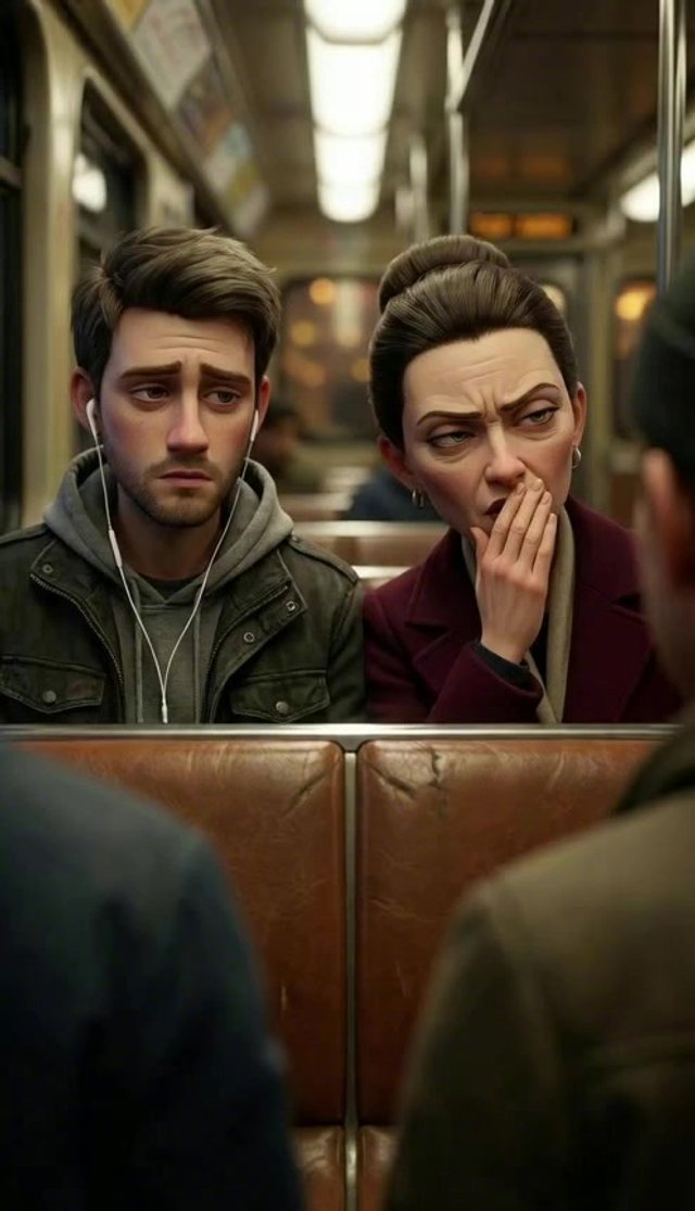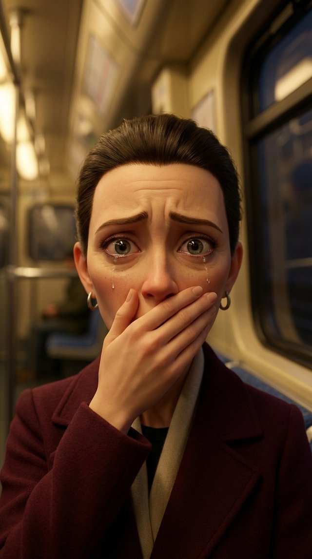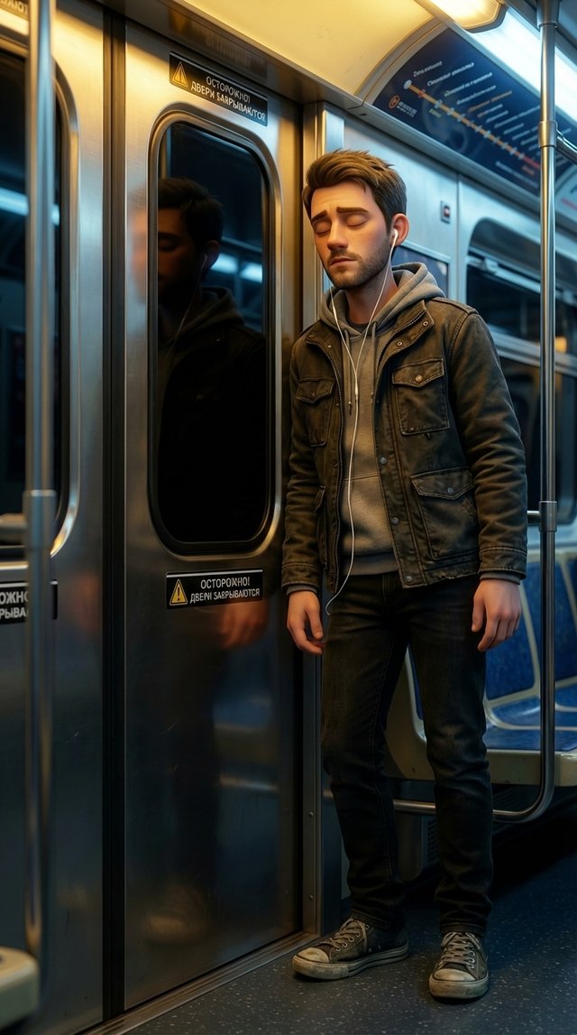 Strong rule: style --- 3D Pixar ---. Центр вагона метро, изолированный от толпы. Экстремально крупный план лица героя. Мягкий, но очень д...