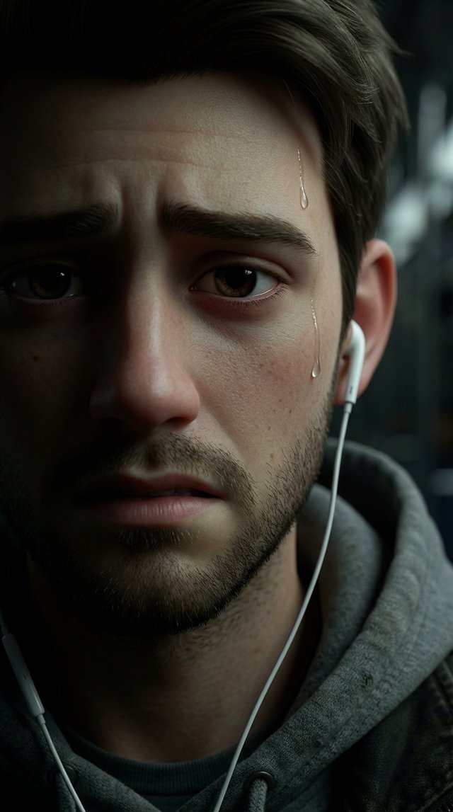 Герой плавно и ритмично двигает плечами и головой, покачиваясь в такт невидимому биту в наушниках, его пальцы слегка отбивают ритм по бед...