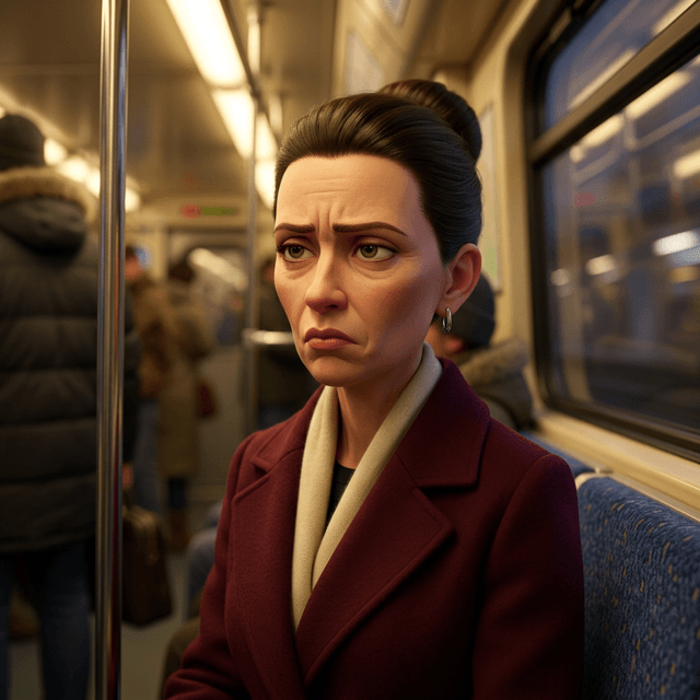 Strong rule: style --- 3D Pixar ---. Сиденья вагона метро на фоне окна. Крупный план лица пассажирки. Тёплый, но тусклый свет вагона мягк...