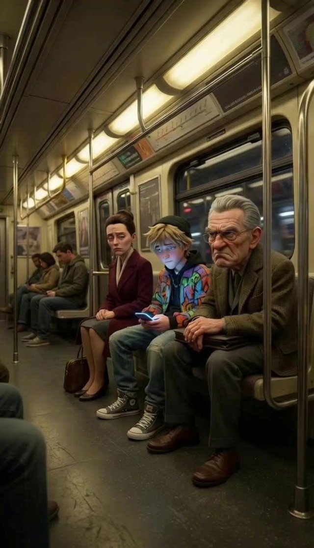 Уставшие пассажиры слегка покачиваются из стороны в сторону в такт движению поезда, совершенно не отрывая пустых взглядов от экранов свои...