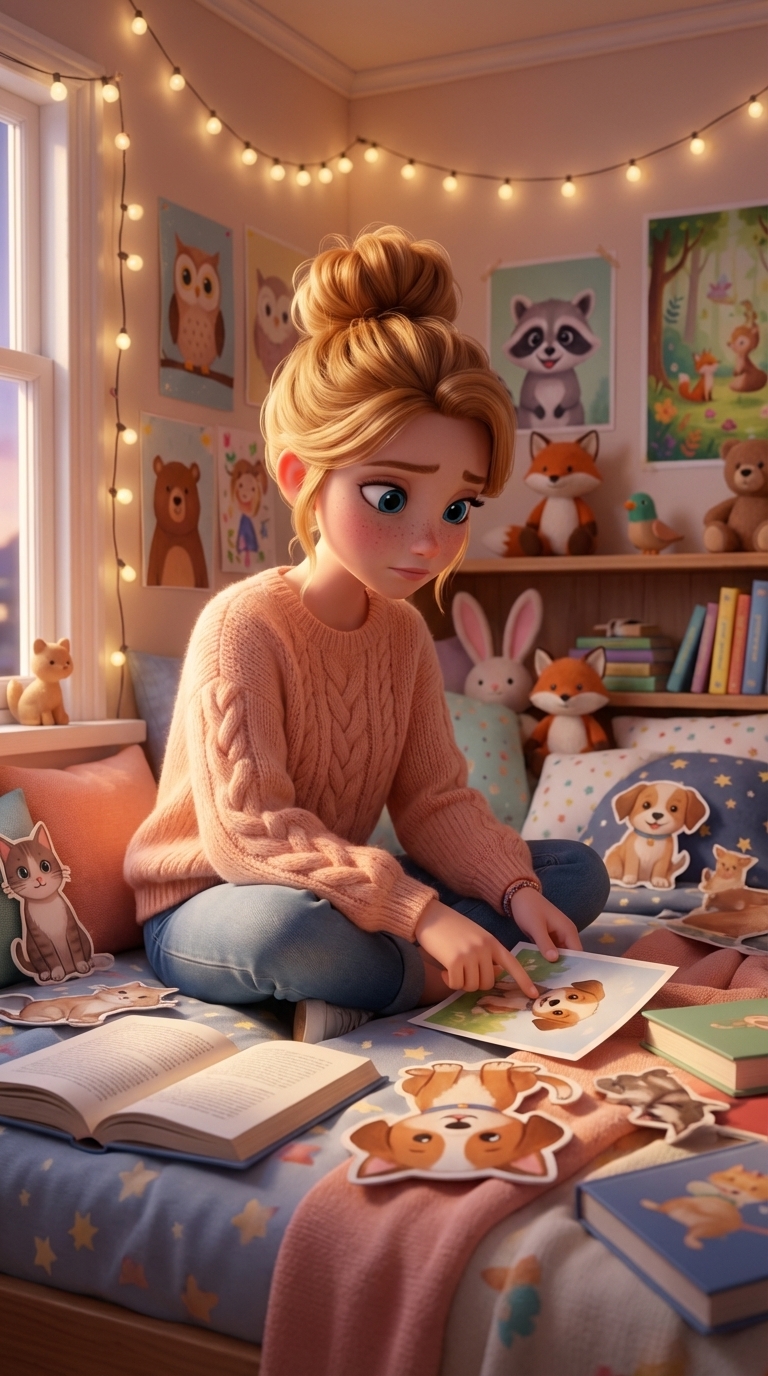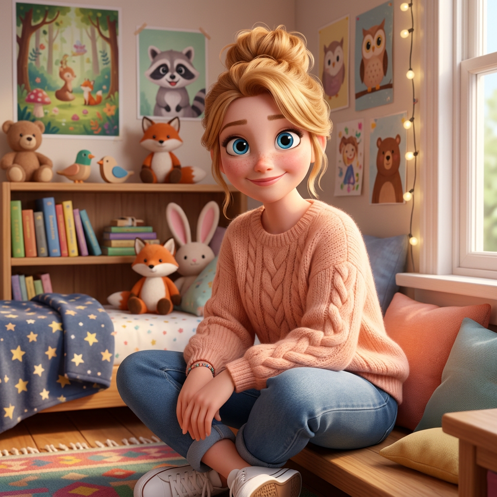 Strong rule: style --- 3D Pixar ---. Уютная спальня в стиле Pixar, залитая мягким вечерним светом из окна. 18-летняя Дар сидит на кровати...