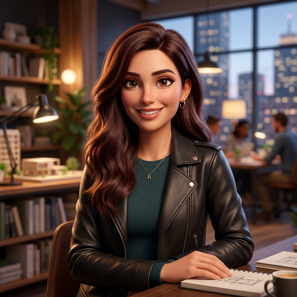 Strong rule: style --- 3D Pixar ---. Стильная 27-летняя женщина в эстетике 3D Pixar. У нее глубокие карие глаза, четко очерченные скулы и...