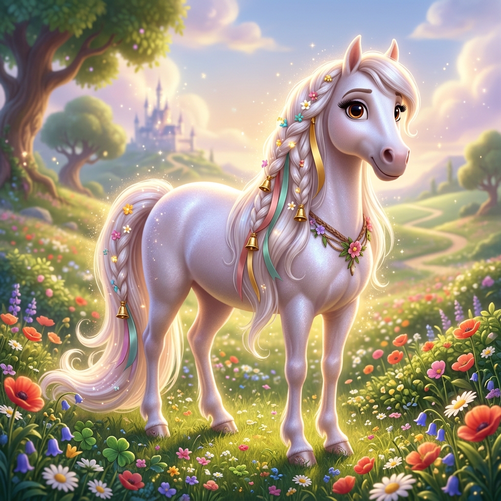 Strong rule: style --- 3D Pixar ---. Величественная сказочная лошадь с необычайно мягкой, бархатистой шерстью жемчужного цвета. У нее огр...