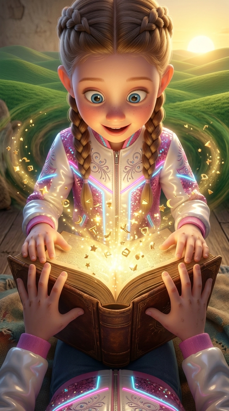 Камера медленно приближается к страницам книги, пока золотые искры начинают кружиться в вихре. Мы видим, как стены комнаты тают, уступая ...