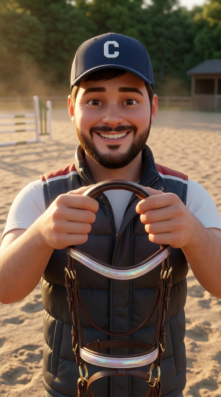 Папа Максим стоит на тренировочном поле, широко улыбаясь. Он одет в профессиональный жилет и кепку. В руках он держ...