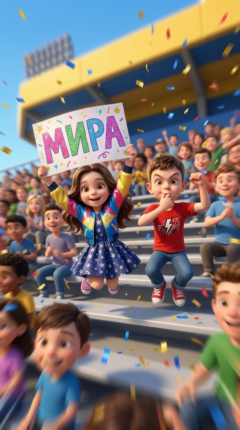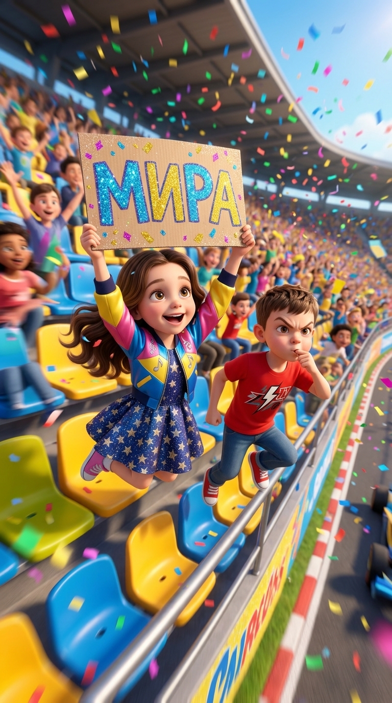 Вид с точки зрения Миры на трибуны, мимо которых она пролетает. Там прыгают от радости Есения и Родион. Есения высо...