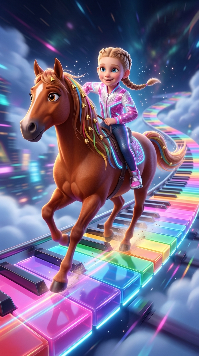 Мира верхом на лошади несется по необычной дорожке, состоящей из гигантских радужных клавиш пианино, парящих в возд...