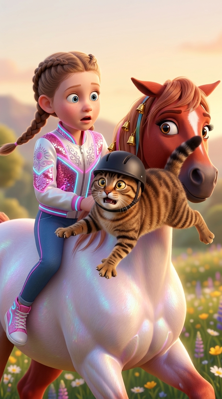 Комичный момент: рыжий кот Дюша в крошечном черном шлеме прыгает на спину лошади позади Миры. Его лапы широко расст...