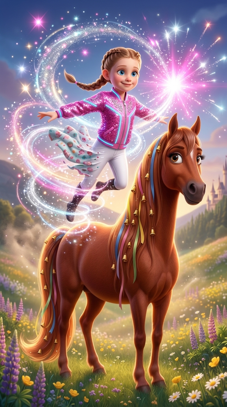 Лошадь мягко приземляется в облако из розовых лепестков роз и разноцветного конфетти. На шее лошади мгновенно матер...