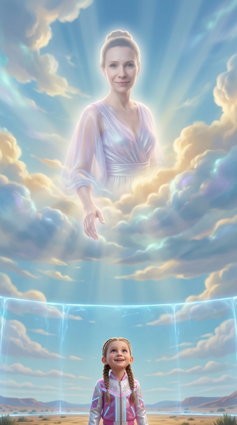 В небе прямо над барьером проявляется полупрозрачный, сияющий образ Мамы Яны. Она выглядит как прекрасная наставниц...