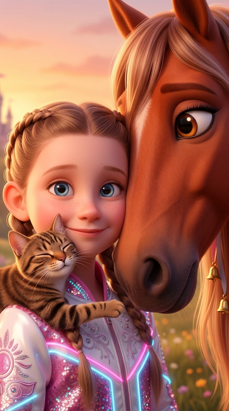 Максимально крупный план: Мира нежно прижимается щекой к теплой морде лошади. Кот Дюша сидит у нее на плече, доволь...