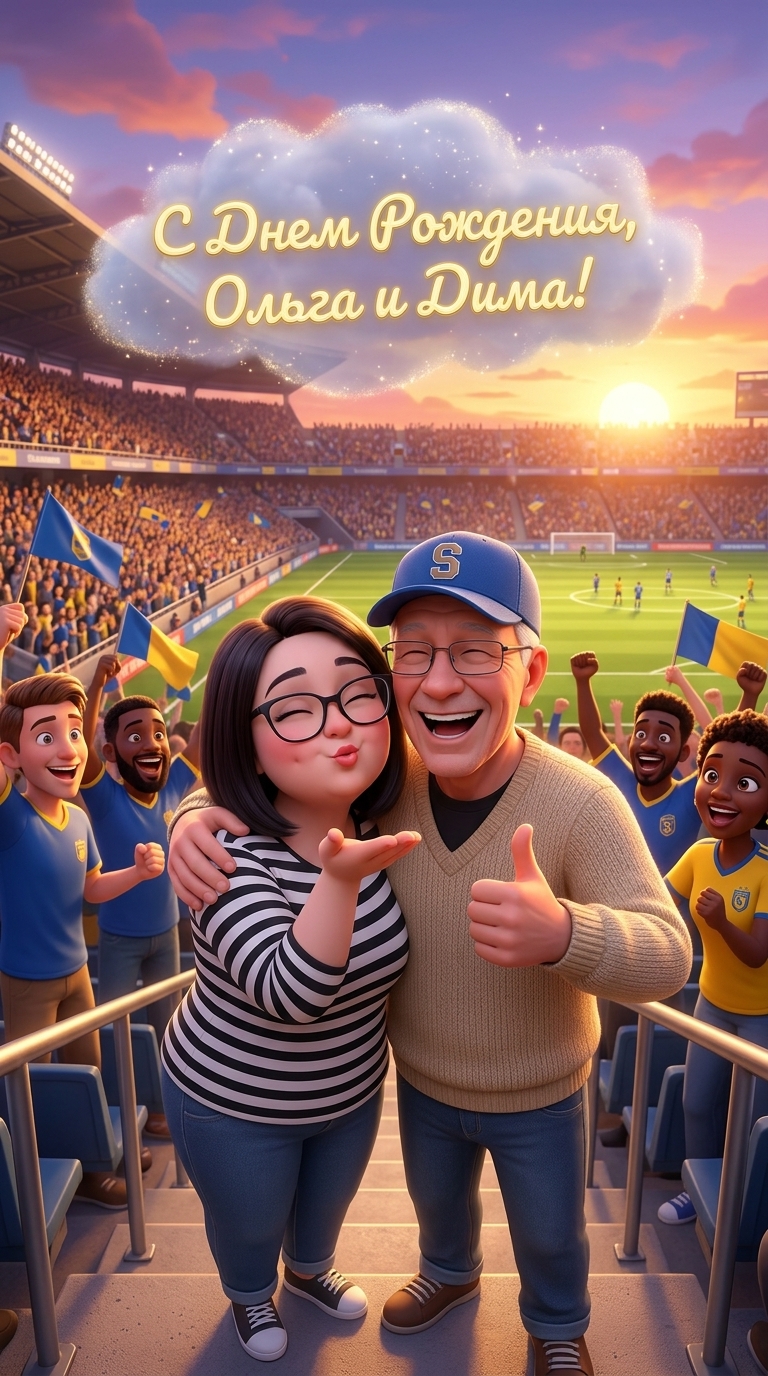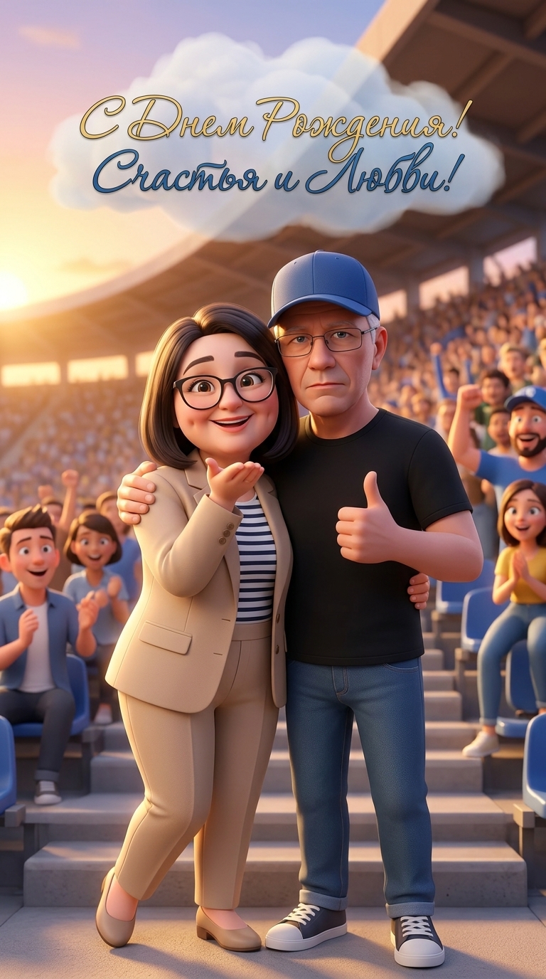 На трибунах стадиона, рядом с друзьями, стоят Бабушка Ольга и Дедушка Дима. Бабушка в элегантном светлом костюме по...