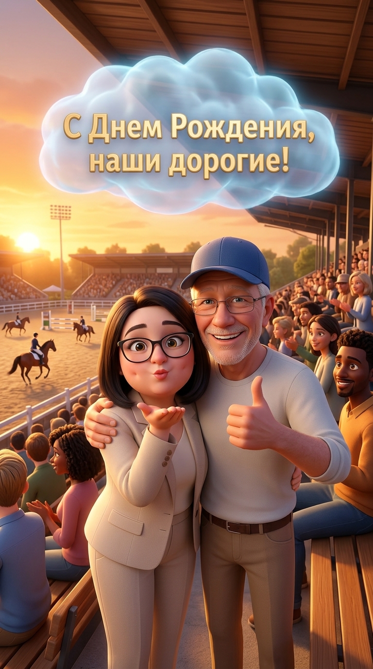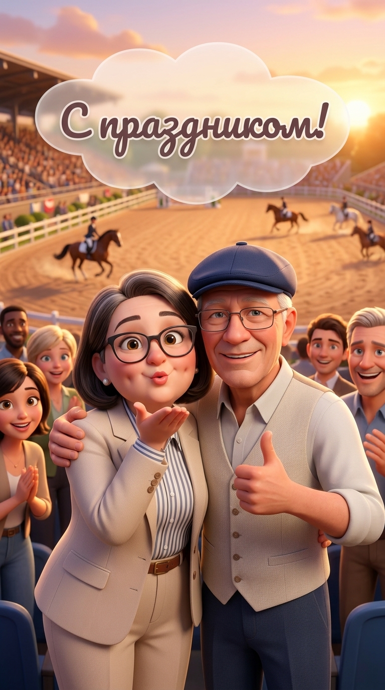 На трибунах стадиона по конному спорту, рядом с друзьями, стоят Бабушка Ольга и Дедушка Дима. Бабушка в элегантном ...