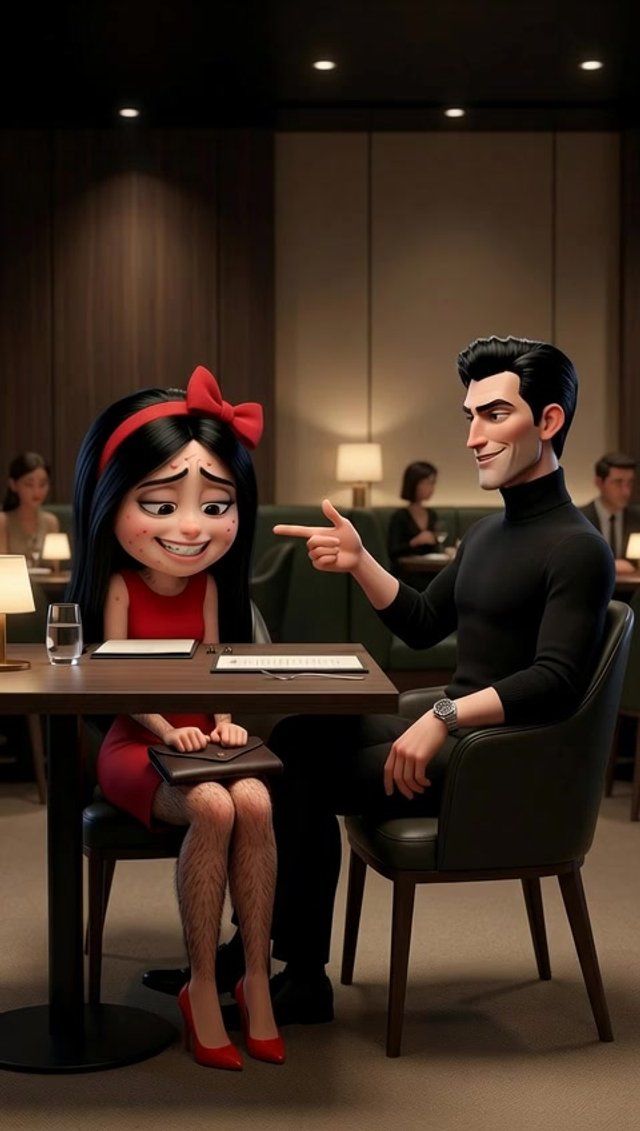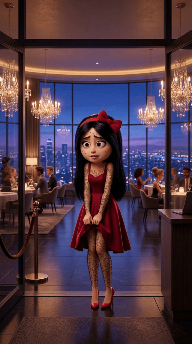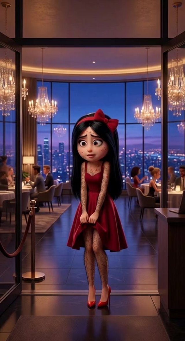 Strong rule: style --- 3D Pixar ---. Шикарный современный ресторан с панорамными окнами и видом на вечерний город. Вагинесса робко входит...
