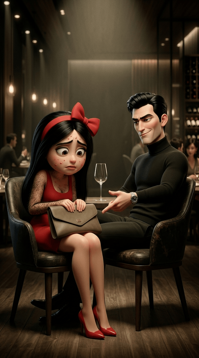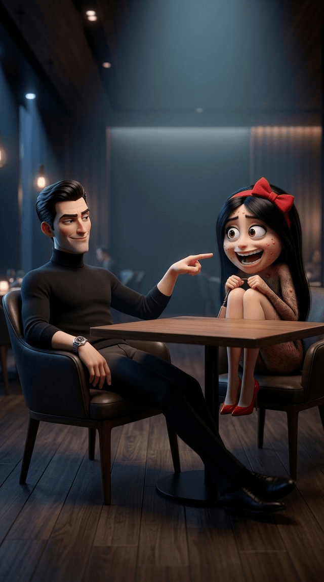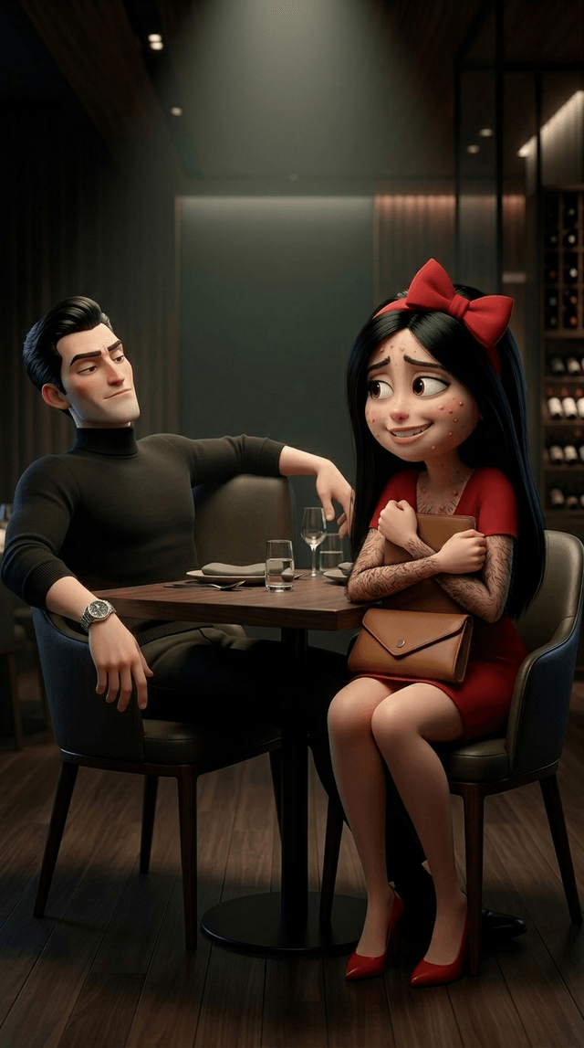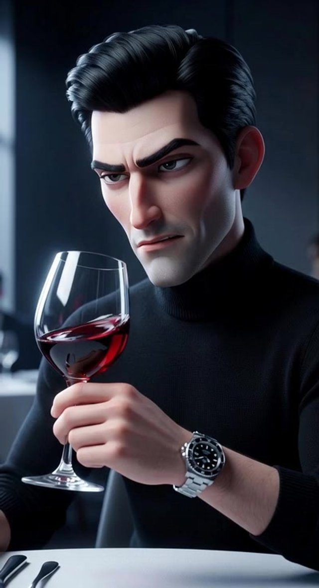 Strong rule: style --- 3D Pixar ---. Крупный план Артёма за столиком ресторана. Он смотрит вниз, за пределы кадра, с брезгливо поднятой б...