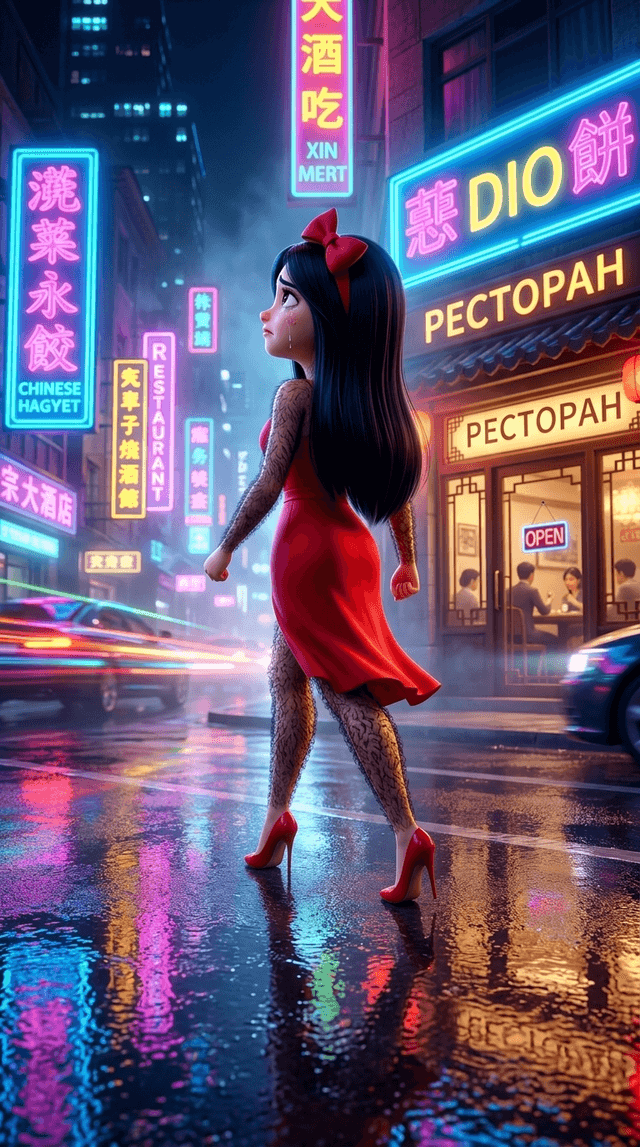 Strong rule: style --- 3D Pixar ---. Вагинесса решительно выходит в красном платье и волосатыми ногами из ресторана на ночную улицу, за...