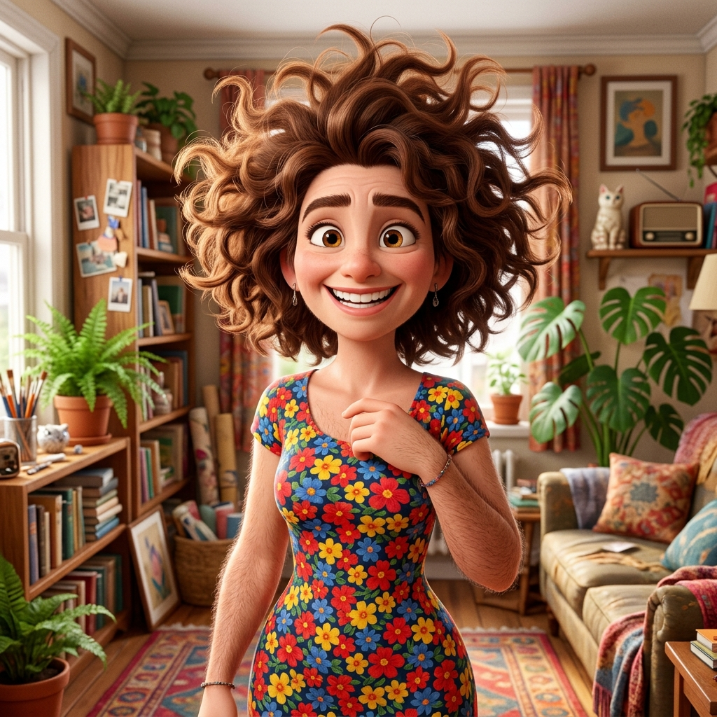 Strong rule: style --- 3D Pixar ---. Обаятельная женщина с копной абсолютно неукротимых, густых каштановых волос, которые торчат в разные...