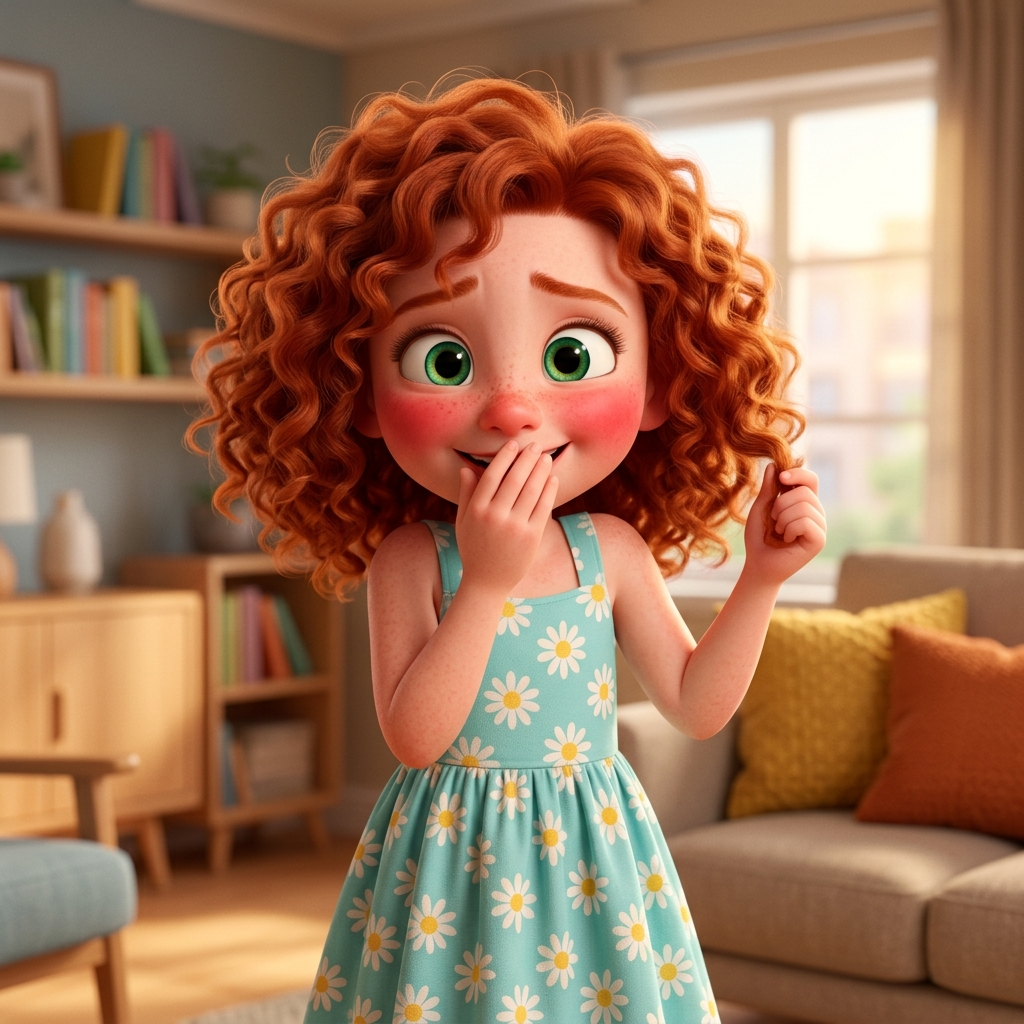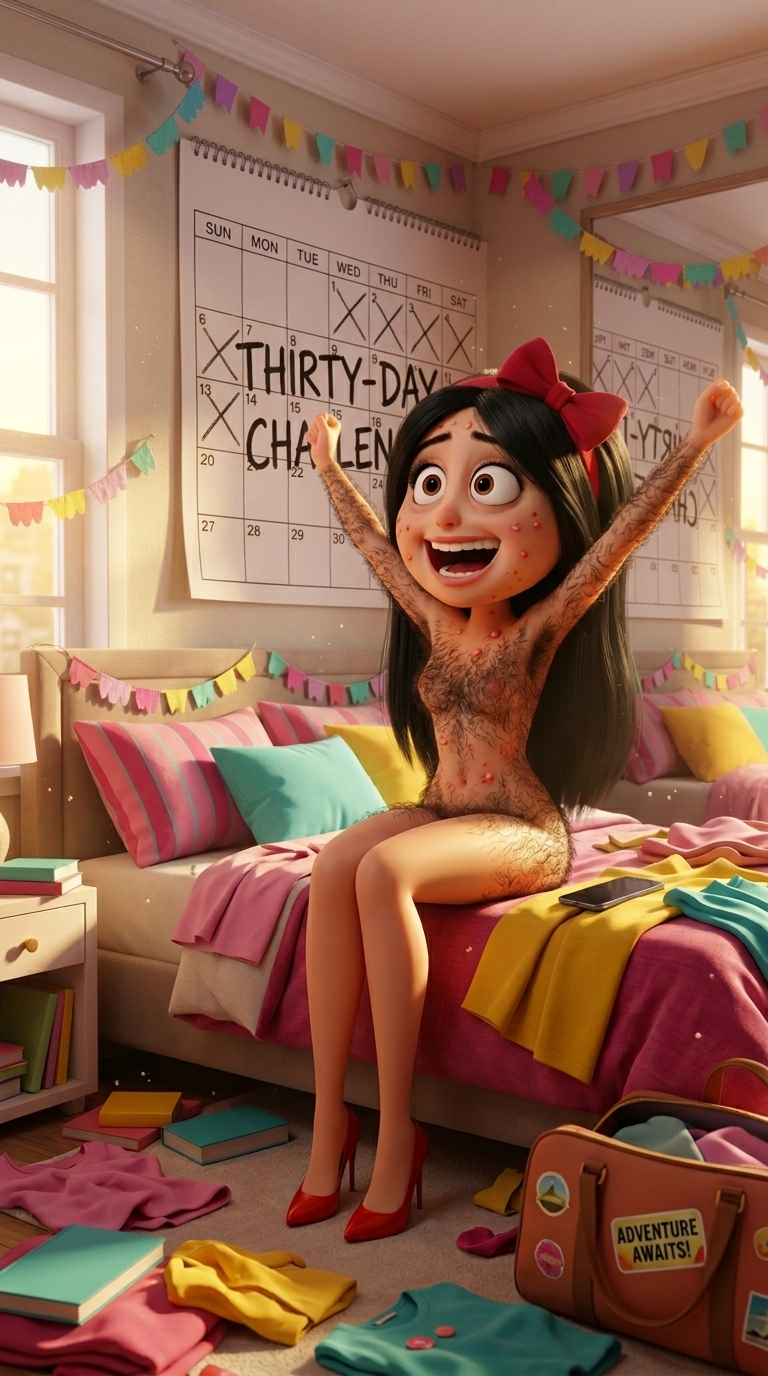 Strong rule: style --- 3D Pixar ---. Уютная спальня в стиле Пиксар, залитая мягким утренним светом. Вагинесса сидит на краю кровати с бал...