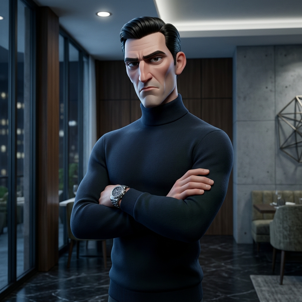 Strong rule: style --- 3D Pixar ---. Strong rule: style --- 3D Pixar ---. Персонаж в стиле 3D Pixar, высокий мужчина с острыми чертами ли...