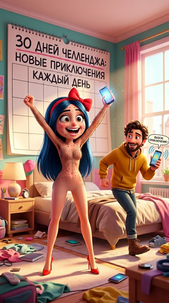 Strong rule: style --- 3D Pixar ---. Яркая и хаотичная спальня с разбросанными вещами. На стене висит огромный бумажный календарь, где жи...