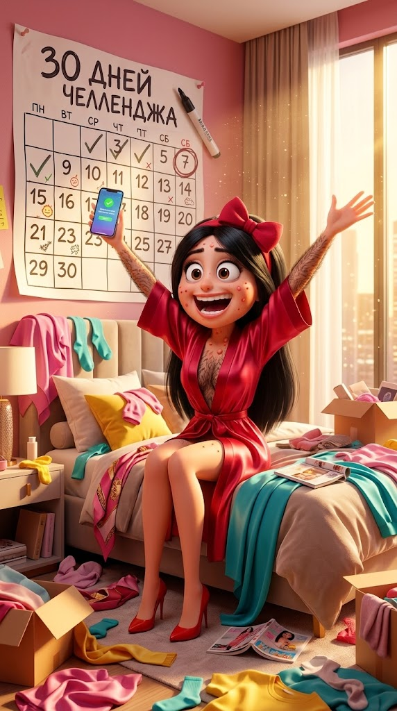 Вагинеса в красном халате атласном с энтузиазмом подпрыгивает к настенному календарю и ставит жирный красный крест на третьей дате. Она...