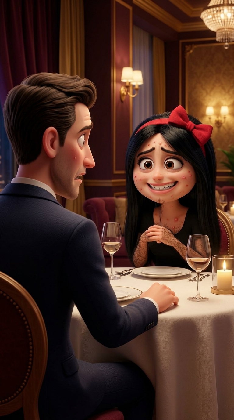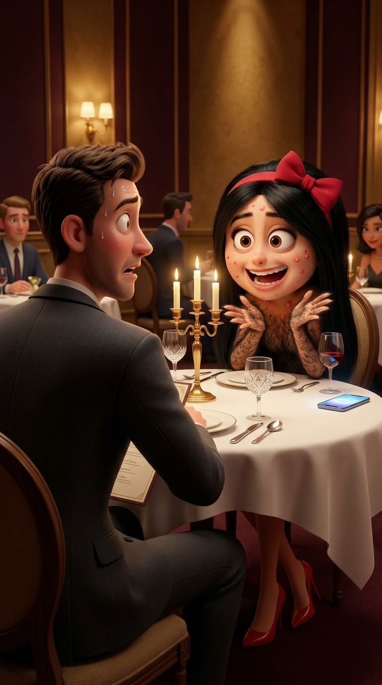 Strong rule: style --- 3D Pixar ---. Интерьер дорогого ресторана с накрахмаленными скатертями и мерцающими свечами. За столом сидит испуг...