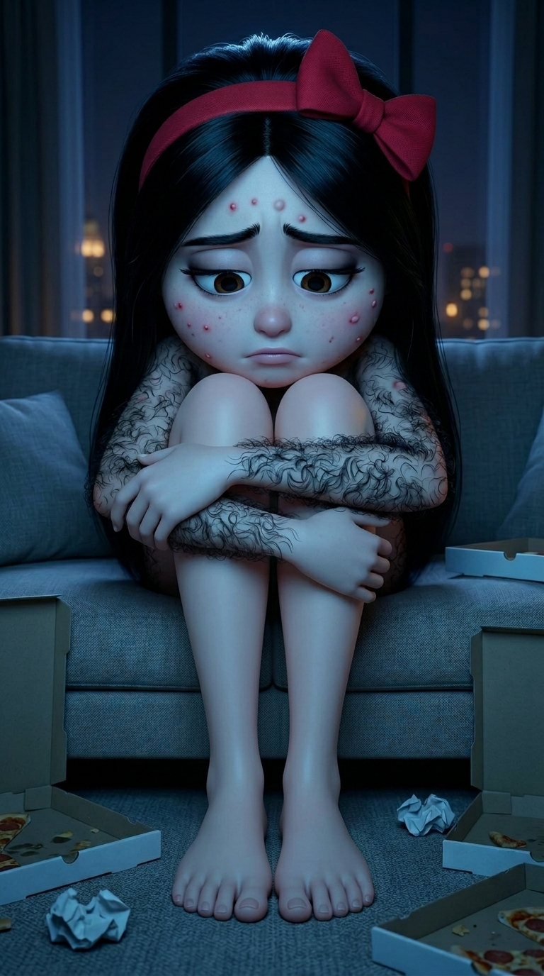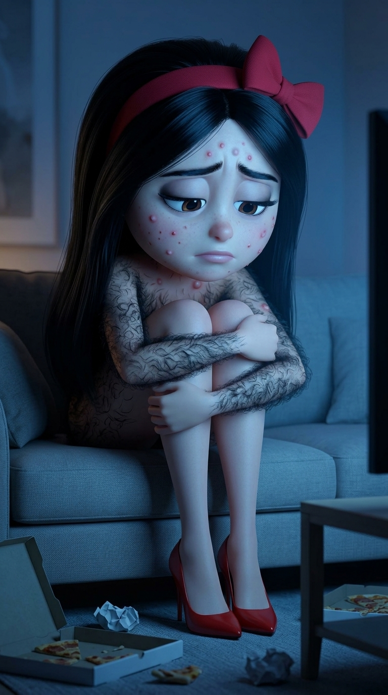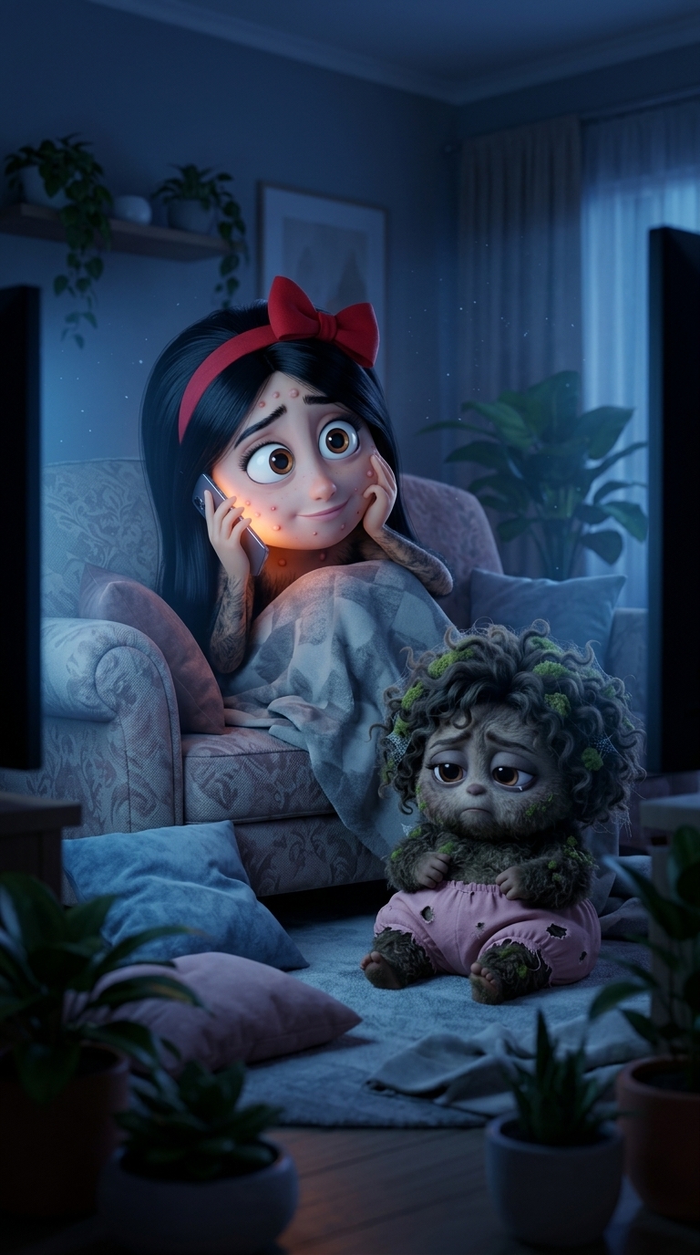 Strong rule: style --- 3D Pixar ---. Вечерняя гостиная, освещенная только синим светом телевизора. Вагинеса сидит на диване, обняв колени...
