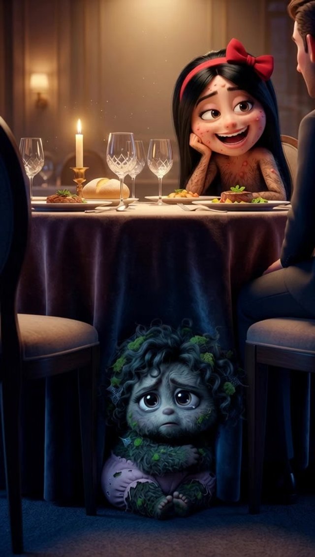 Strong rule: style --- 3D Pixar ---. Интерьер дорогого ресторана с мягким приглушенным светом свечей. Вагинесса сидит за столиком напроти...