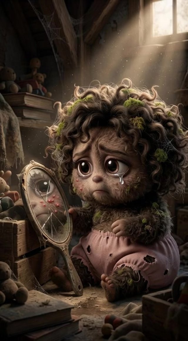 Вагинесса радостно кружится перед зеркалом, поправляя подол платья, её лицо светится от счастья. Камера плавно наезжает на её отражение в...