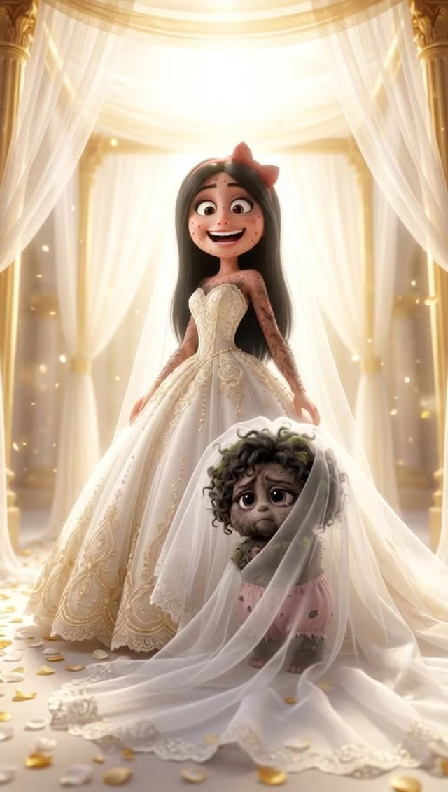 Strong rule: style --- 3D Pixar ---. Воображаемая сцена свадьбы в белоснежных и золотых тонах. Вагинесса в пышном свадебном платье стоит ...