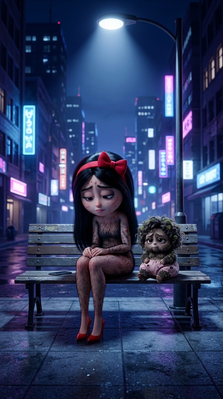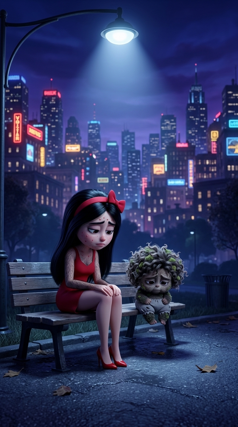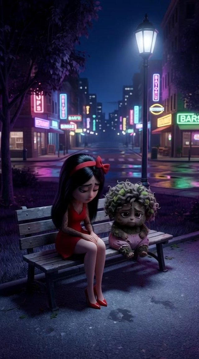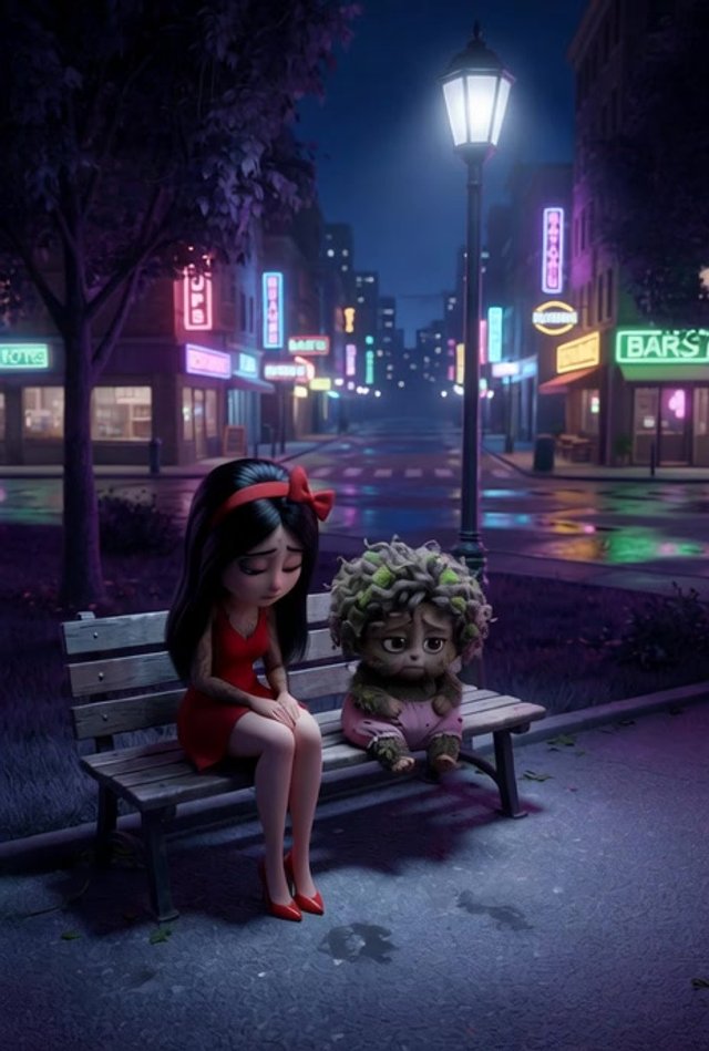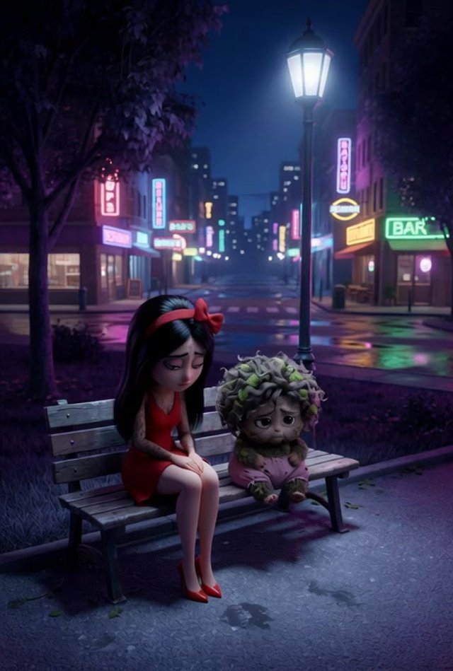 Strong rule: style --- 3D Pixar ---. Ночная городская улица, освещенная неоновыми вывесками. Вагинесса сидит на скамейке в парке под свет...